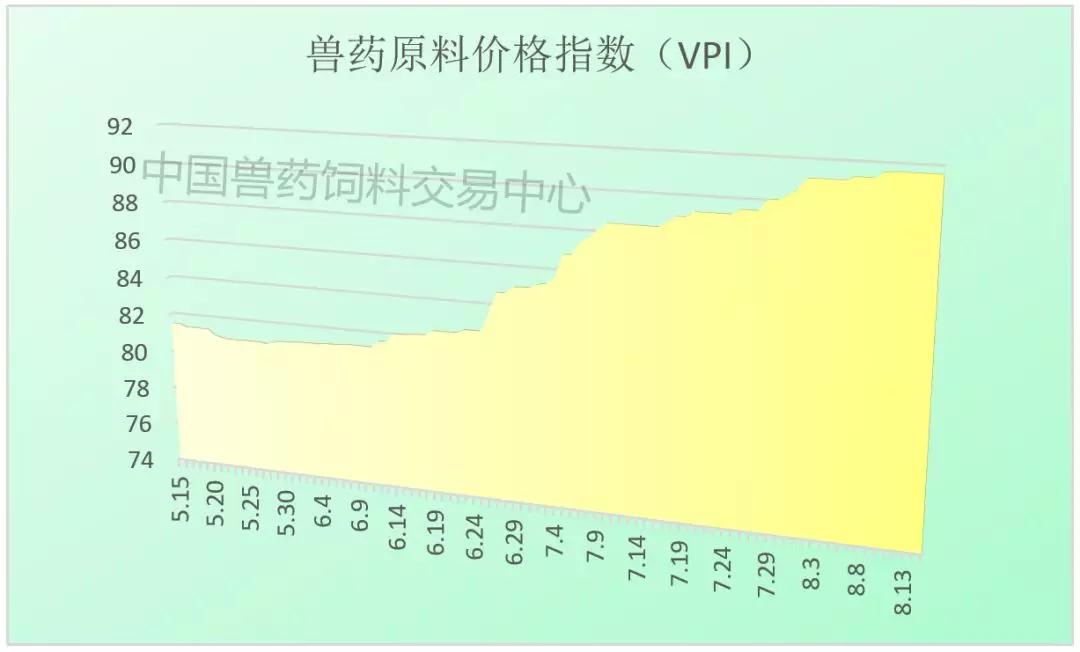1、8月15日兽药原料价格指数(VPI)91.65,并持续上涨,使用层面需求量逐步平稳,受环保、原料价格、例行停产检修期等因素影响延续,兽用原料部分用量较大品种供应紧张,注意货源把握。