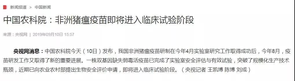2019年9月10日,中国农科院发布,我国非洲猪瘟疫苗研制在今年4月实验室研究工作取得成功后,今年8月,疫苗研发工作又取得了新的重要进展。一株双基因缺失弱毒活疫苗已完成了实验室安全评估与有效试验,突破了规模化生产技术瓶颈,近期已向农业农村部提出生物安全评价申请,即将进入临床试验阶段。