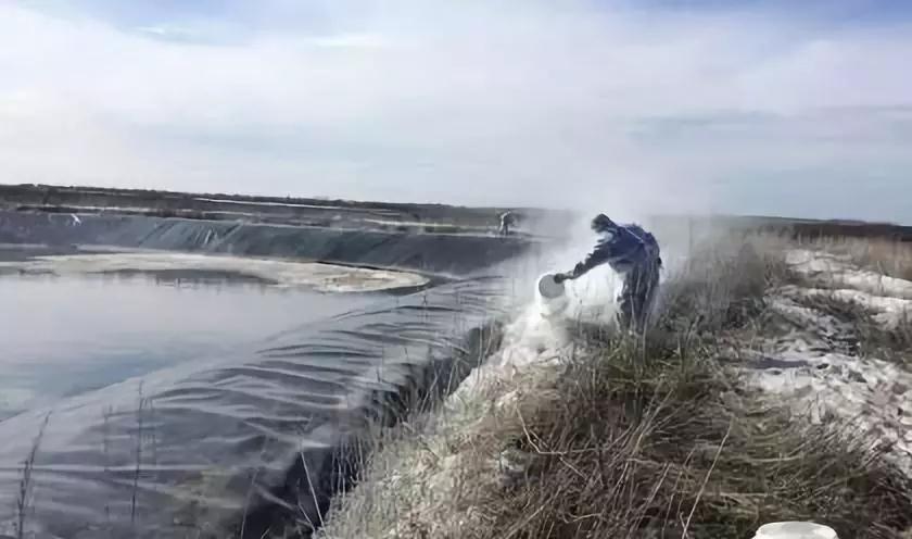 处理粪便泻湖:用25%干漂白剂粉末消毒剂覆盖猪场所述范围。图:Gustavo Lopez