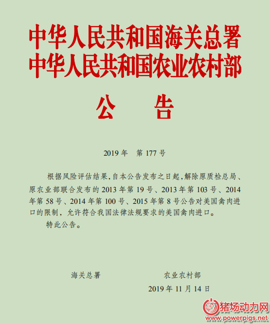 昨日,海关总署公告,根据风险评估结果,自本公告发布之日起,解除原质检总局、原农业部联合发布的2013年第19号、2013年第103号、2014年第58号、2014年第100号、2015年第8号公告对美国禽肉进口的限制,允许符合我国法律法规要求的美国禽肉进口。