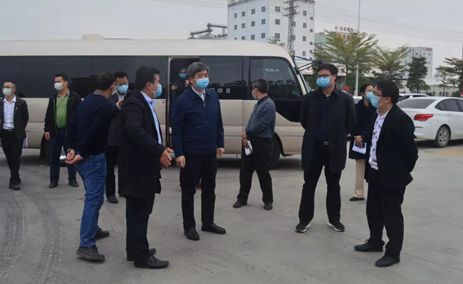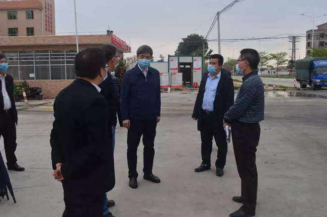 william威廉中文官网讯 2月11日,茂名高州市委书记黄晨光率市领导倪伟涛、梁逸峰及相关部门负责人莅临茂名傲新,针对疫情防控和复工复产工作做专项督导检查。茂名傲新总经理严二存就基地疫情防控措施及复工复产情况做了详细汇报。