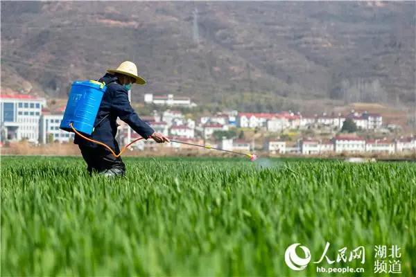 湖北省襄阳市保康县马桥镇中坪村村民在麦田喷洒农药。