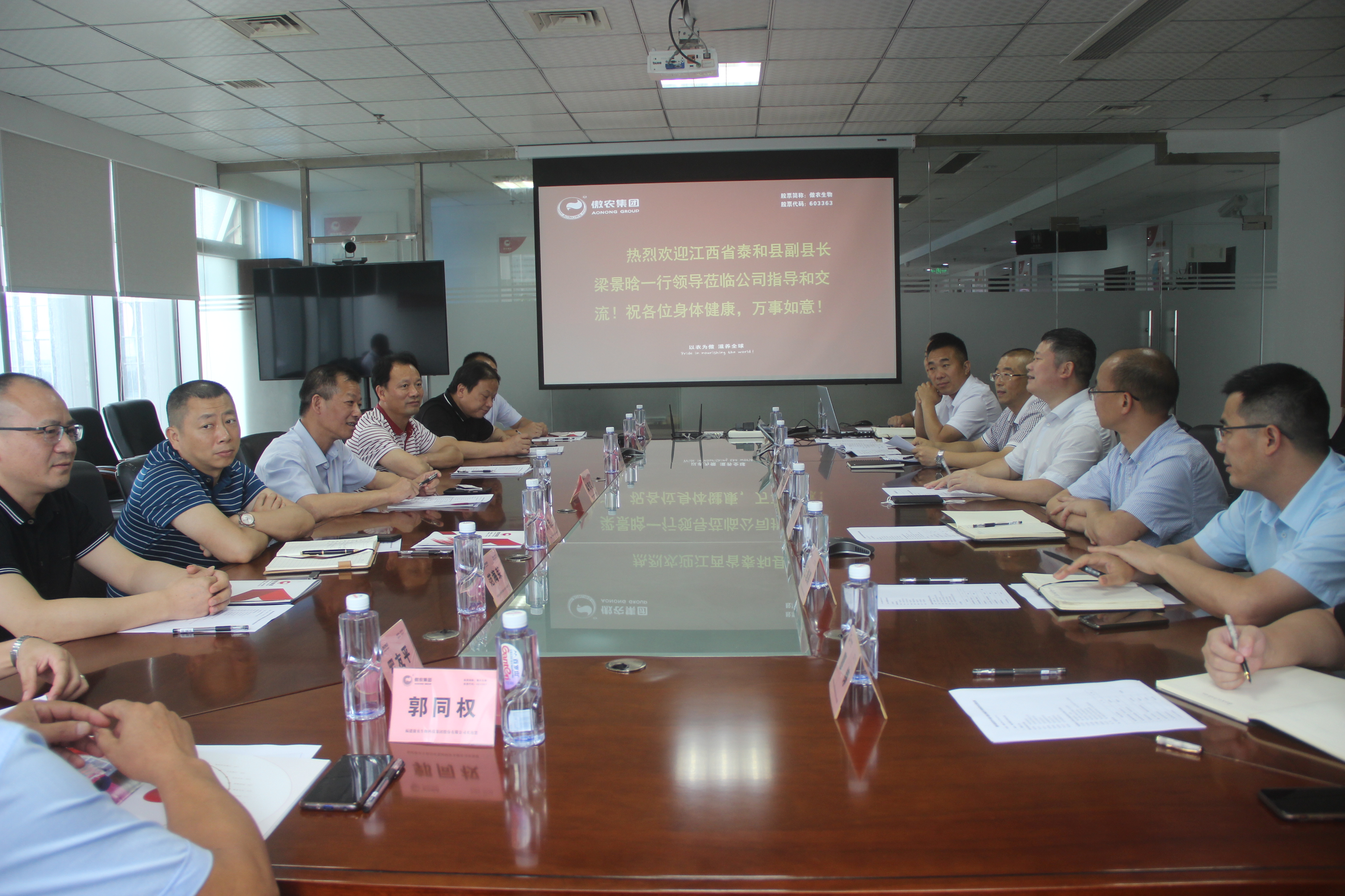 william威廉中文官网讯 6月10日,泰和县副县长梁景晗率队莅临集团厦门总部,就集团在泰和布局屠宰项目具体事宜举行座谈。泰和县高新区管委会主任周征生、生态环境局长刘忠山、商务局长凌扬海、驻福建招商局长范海荣等参加座谈。集团董事长吴有林对梁景晗副县长一行的到来表示欢迎。座谈会由集团食品产业总部总裁洪远湘主持。