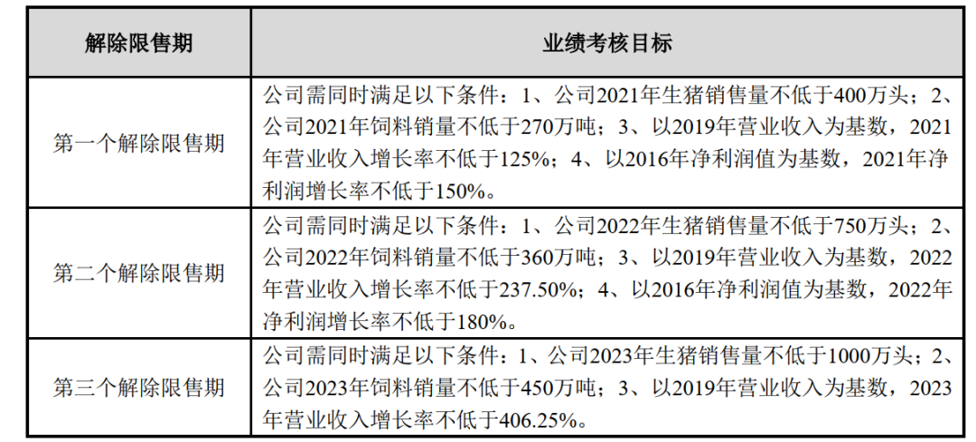 其中2021年度的考核目标有四个,分别为2021年生猪销售量不低于400万头;2021年饲料销量不低于270万吨;以2019年营业收入为基数,2021年营业收入增长率不低于125%;以2016年净利润值为基数,2021年净利润增长率不低于150%。
