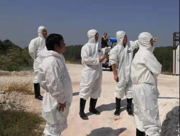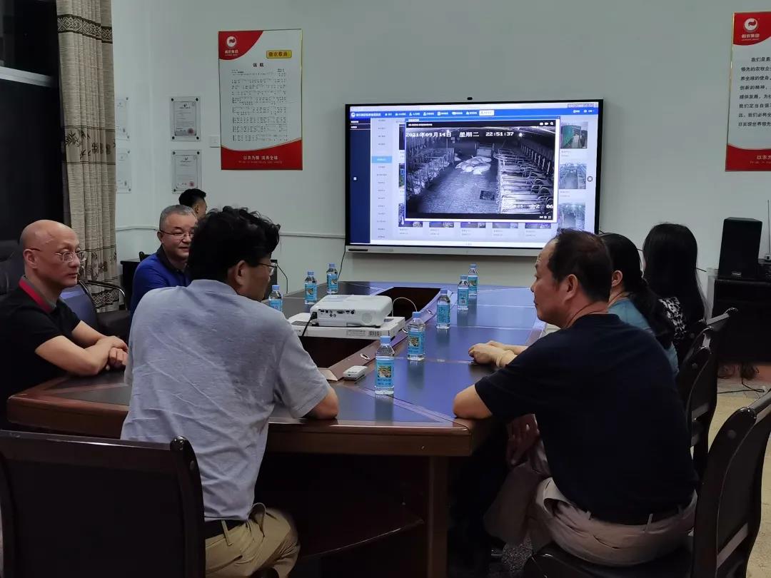 图:黄路生院士(左三)深入泰和傲牧基地开展一线调研,丁能水总裁(右二)向黄路生院士介绍基地生产情况。